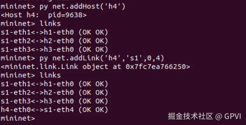 3. 在2 b)的基础上,在Mininet交互界面上新增1台主机并且连接到交换机上,再测试新拓扑的连通性。