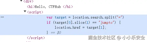 我们查看源码发现JS内容主要是通过分隔字符串=,生成一个数组,并判断数组的第一个元素(.slice(1)的意思就是从第二个到最后,相当于去掉第一个元素)是否为jumpto并用第二个元素作为地址跳转