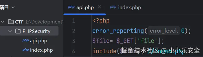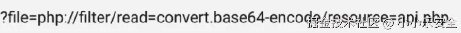 看到file=index这种类似的URL时就应该想到这里可能存在文件包含漏洞,且猜测后端源码为index拼接.php,这里我们写两个文件:一个文件为index.php,用于文件包含;一个文件为api.php,里面是php代码。当输入以下payload后,可成功将api.php的内容Base64编码后输出