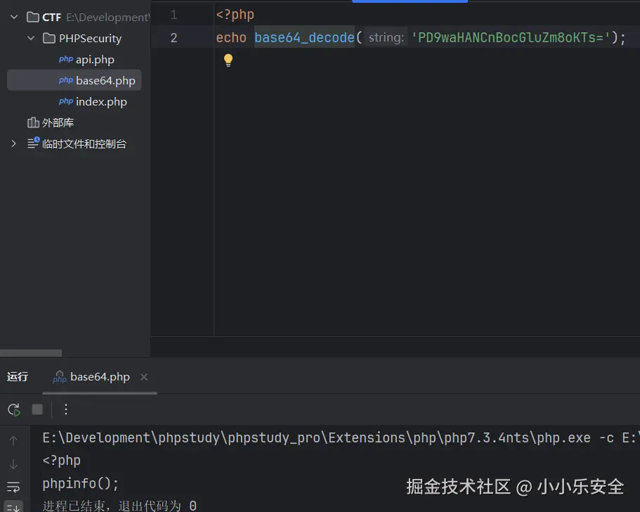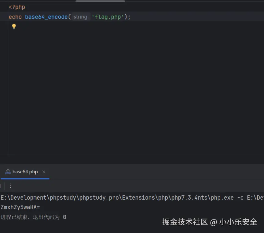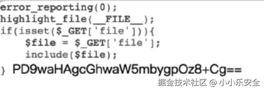 然后经过过滤器对其进行Base64编码,最后包含进来。由于Base64编码后不是PHP代码,而是一些普通字符,所以会直接输出。之后我们可以调用PHP的Base64或者在线工具解密一下获取到的源码