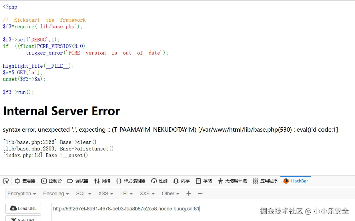 可以看到这是一个F3框架,在base.php中530行有一段关于eval()函数报错