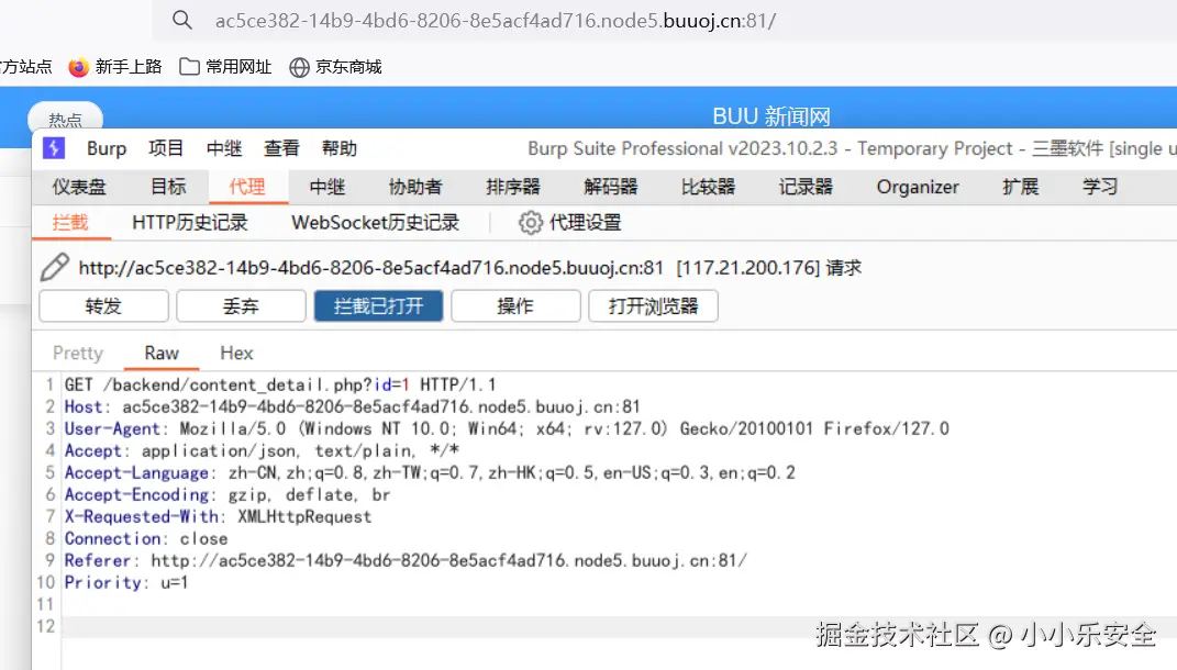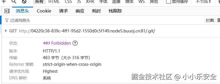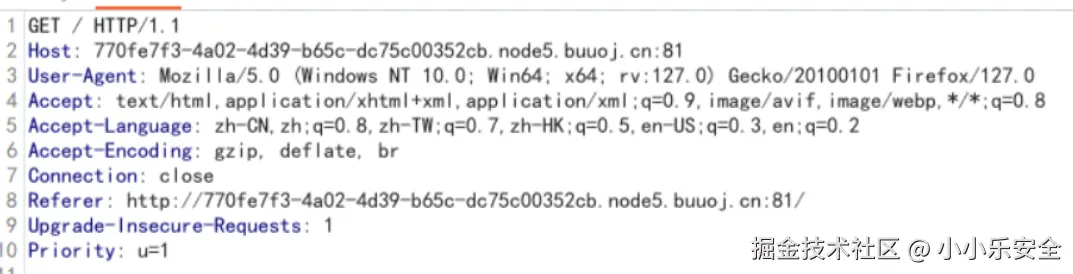 • Referer:一般表示请求来源,Referer头会告诉服务器用户是从哪个页面过来的,比如下图中请求来源于http://770fe7f3-4a02-4d39-b65c-dc75c00352cb.node5.buuoj.cn:81/