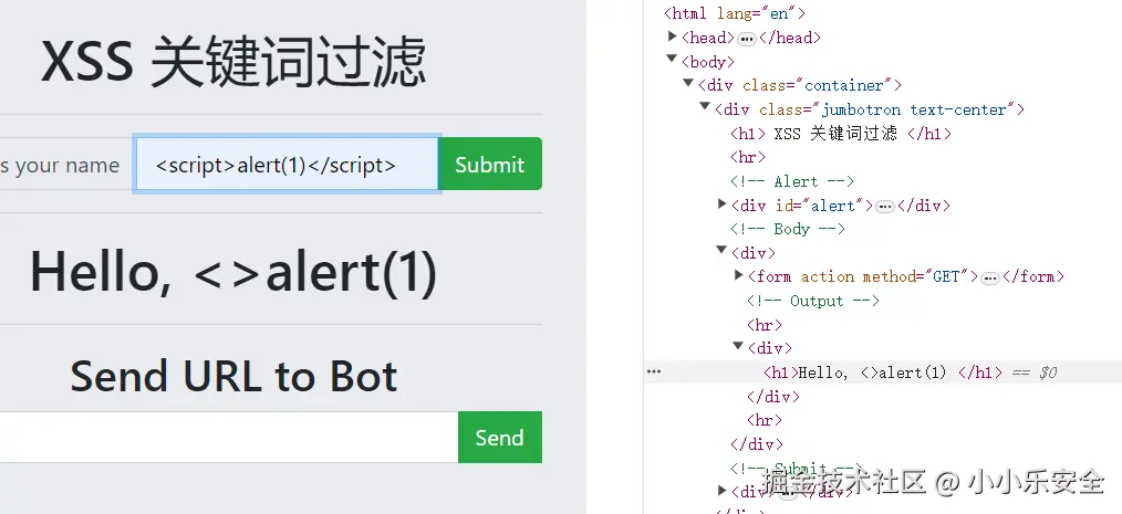 我们尝试输一个简单的JS弹窗,查看源代码判断应该是过滤了关键字script,结合我们在XSS安全平台的Payload,可能是根据ASCII码判断,就试试大写