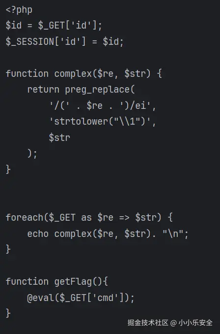 preg_replace函数的第一个参数是正则表达式模式,其中/ei是修饰符。e修饰符表示将替换部分作为PHP代码进行求值,i修饰符表示忽略大小写。'/(' . $re . ')/ei'构建了一个正则表达式模式,用于匹配$re。'strtolower("\1")'是替换部分,将匹配的内容转换为小写。$str是要进行替换的目标字符串。