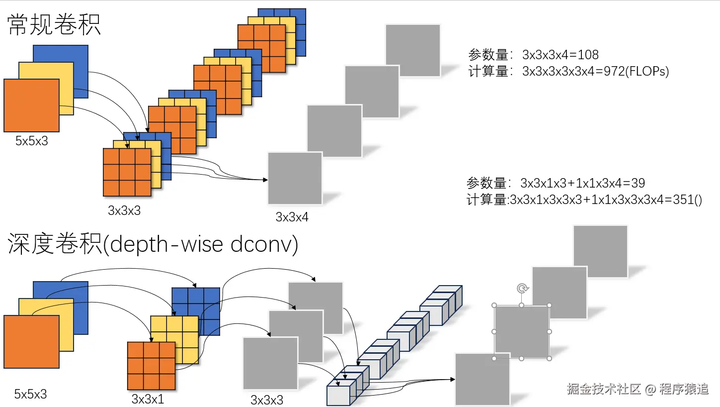 使用深度卷积dconv代替传统卷积conv原理(下图是我自己查阅和整理后所绘制的深度卷积如何代替传统卷积的图片)