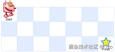 机器人每次只能向下或者向右移动一步。机器人试图达到网格的右下角(在下图中标记为 “Finish”)。