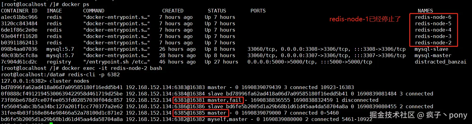 从下图可以看出,redis-node-1已经停止了,节点状态已经是【fail】。从2-3中可以得知6381(主)和6385(从)是主从关系,现在6381(主)挂机了,6385(从)上位变成了master。