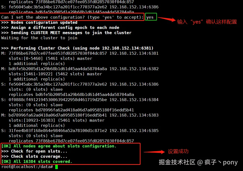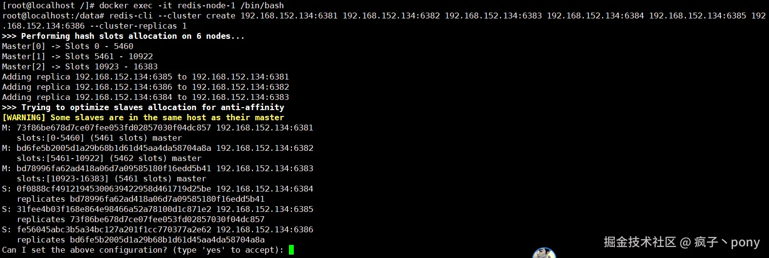 redis-cli --cluster create 192.168.152.134:6381 192.168.152.134:6382 192.168.152.134:6383 192.168.152.134:6384 192.168.152.134:6385 192.168.152.134:6386 --cluster-replicas 1
