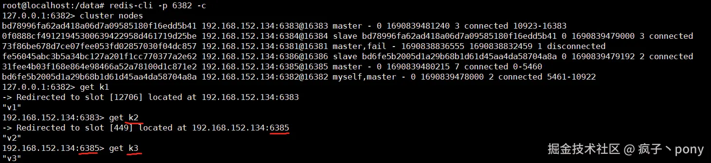 节点redis-node-1停止后,我们依然可以获取到之前在redis-node-1中设置的 k2 和 k3 信息,因为6381(主)和6385(从)是主从关系。说明我们配置主从和集群是正确的。