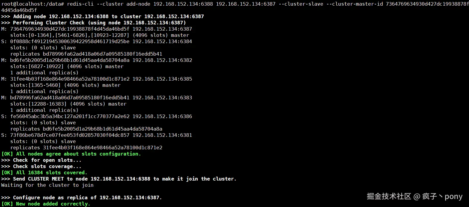 redis-cli --cluster add-node 192.168.152.134:6388 192.168.152.134:6387 --cluster-slave --cluster-master-id 7364769634930d427dc19938878f4d45da46bd5f