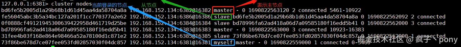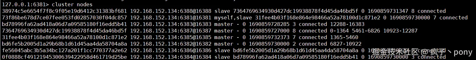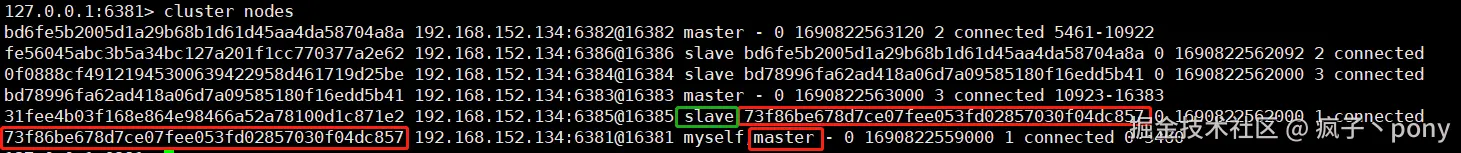 进入Redis后【cluster nodes】所展示的信息,从下图中可以得知【主6381 - 从6385;主6382 - 从6386;主6383 - 从6384】。
