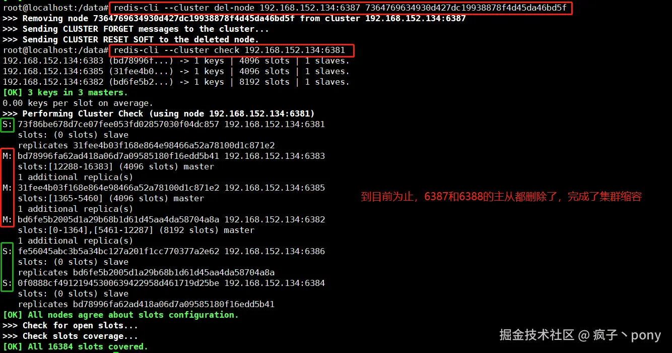 目前的主从结构如下图。现在我们要缩容,把之前添加的6387和6388这对主从删除。