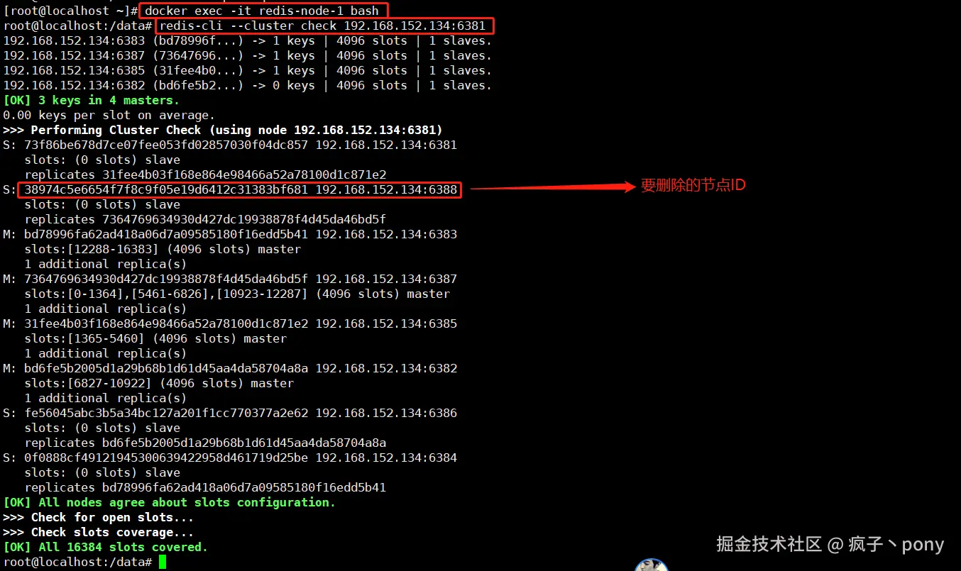 # 命令:redis-cli --cluster del-node ip:端口 6388节点ID