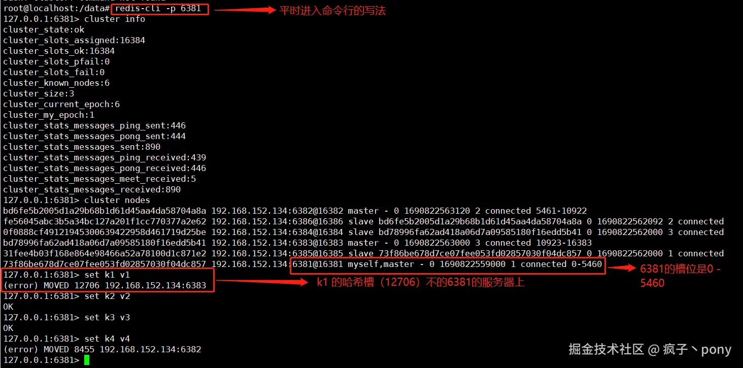 通过【redis-cli -p 6381】命令进入redis,在存储信息的时候会发现哈希槽不匹配,不能存储数据。如下图所示: