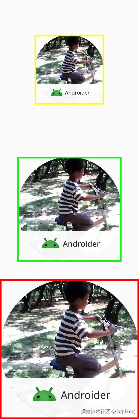 前面说了,在过渡期间,页面上只会渲染目标内容(200dp 的图片),为了模拟该场景,上面 3 个 Image 都带有 size(200.dp) 修饰符。