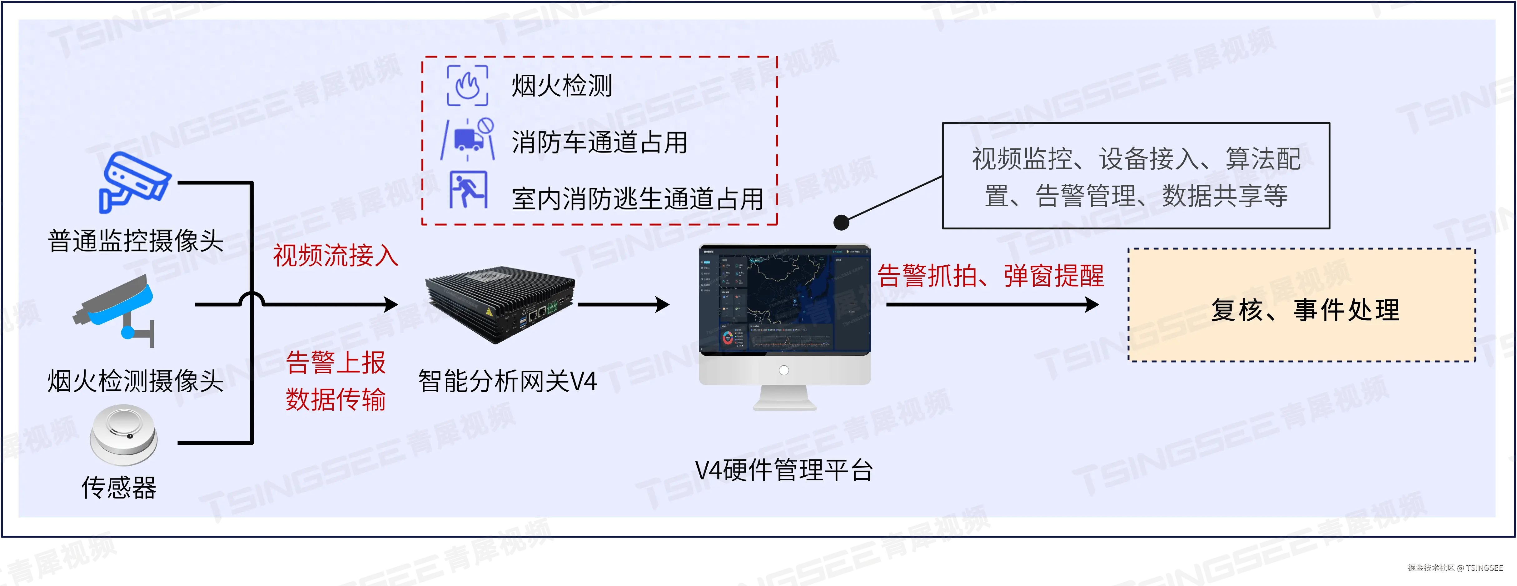 在算力方面,TSINGSEE青犀智能分析网关V4硬件采用BM1684芯片,集成高性能8核ARMA53,主频高达2.3GHz,INT8峰值算力高达17.6/32Tops。平台支持前端设备管理、实时视频预览、录像与云存储、告警推送、取证抓拍、算法在线加载及优化、数据态势分析大屏等。
