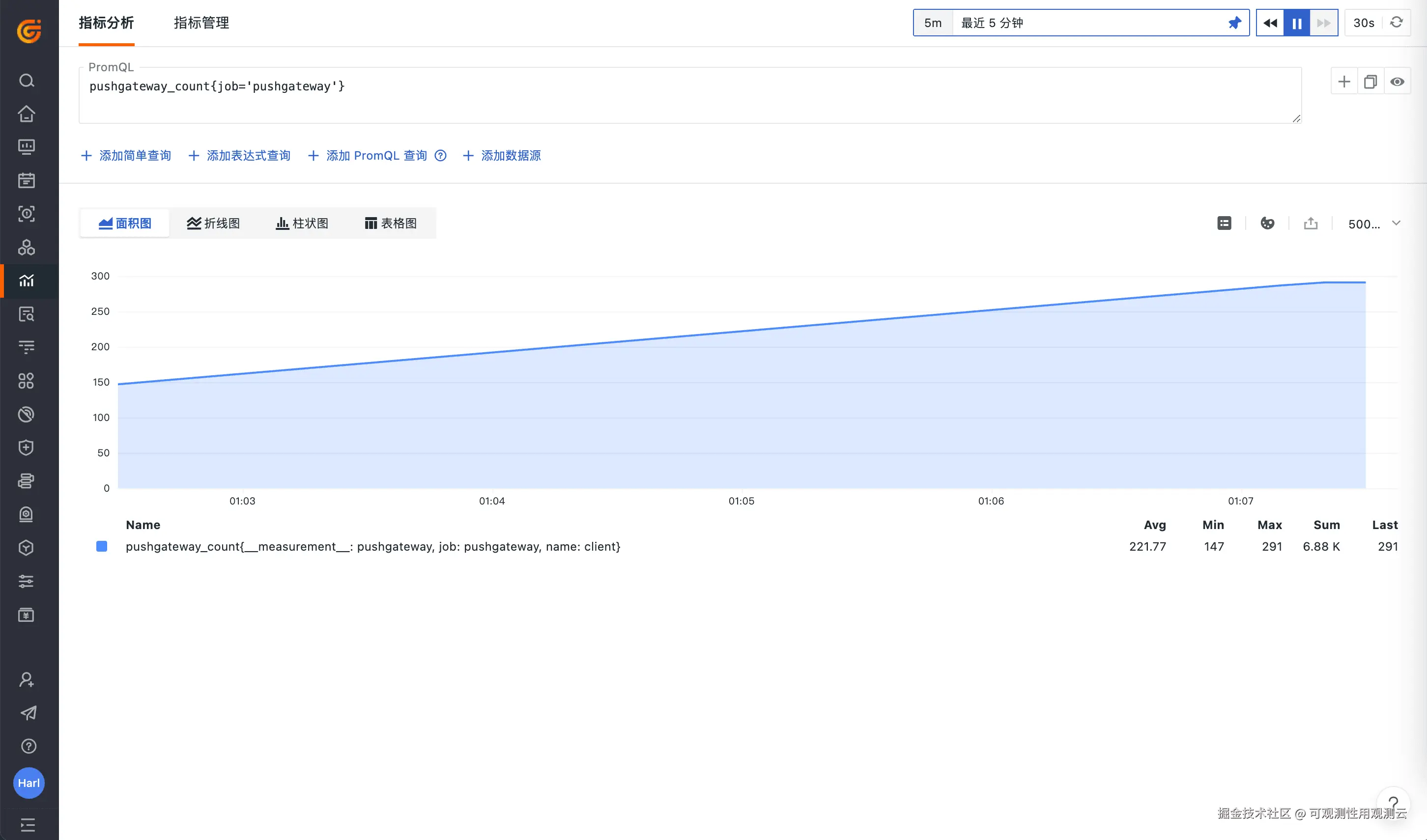 默认会上报至 pushgateway 指标集,通过观测云指标面板即可查询指标数据,也可通过 promQL 查询上报的指标数据。
