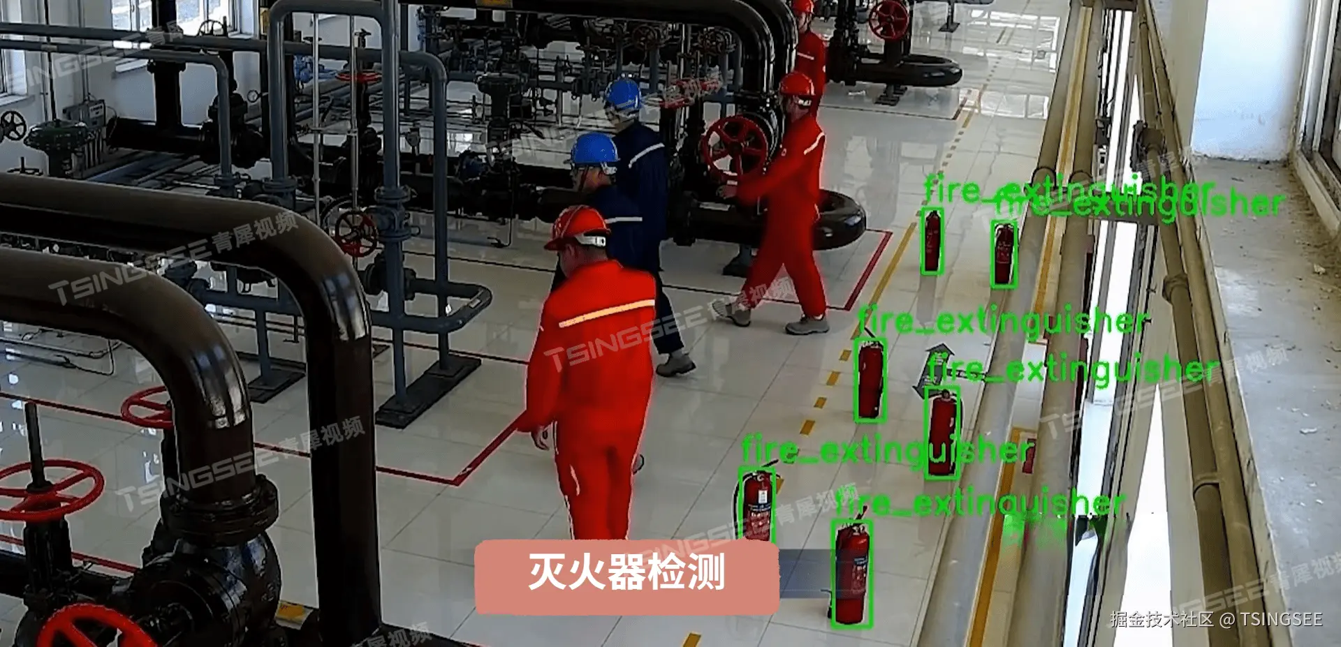 - 结果反馈:自动识别灭火器并标识其位置,并在发现异常时立即发出告警信号,通知相关人员进行处理。