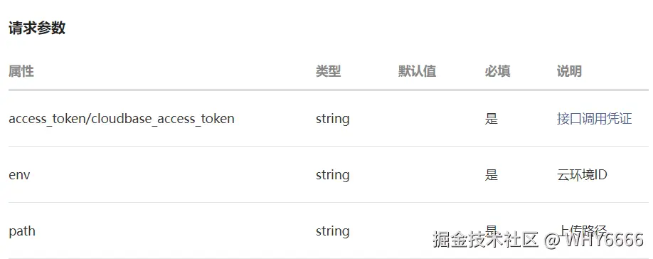 其中access_token是接口调用凭证,需要另外获取;env是云环境ID;path是上传路径,格式目录+文件名