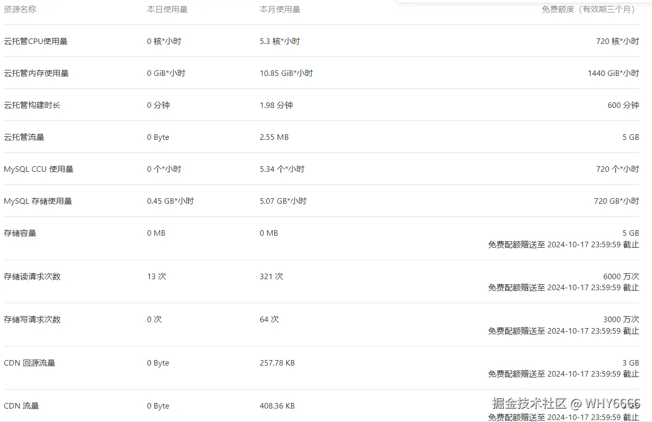 其计费方式为按量付费模式,首个环境赠送一定的免费额度,有效期为3个月,资源信息大致如下: