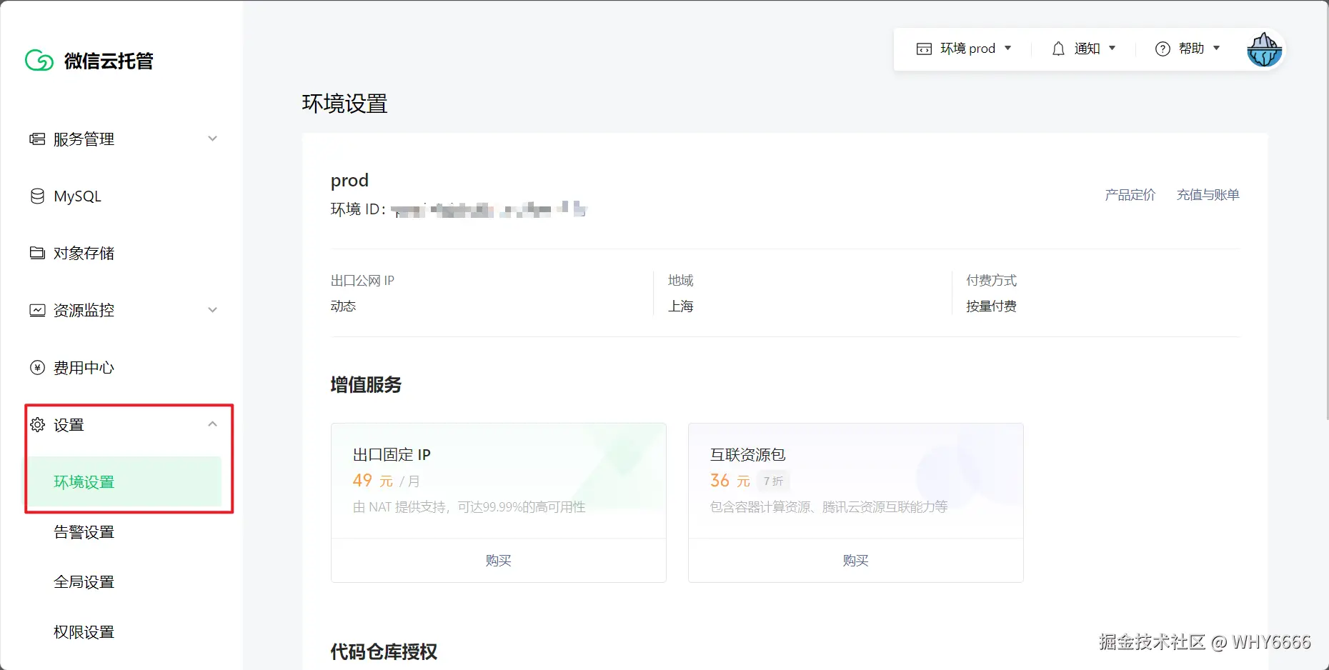 微信云托管的环境ID可以在【设置】——【环境设置】中查看: