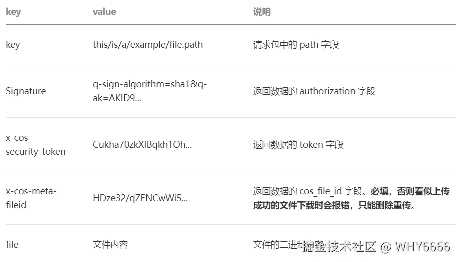 Signature、x-cos-security-token和x-cos-meta-fileid参数分别对应返回包的authorization、token、和cos_file_id字段