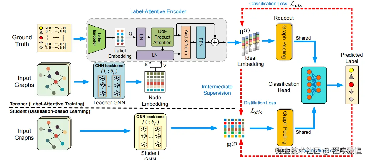 该框架图可以看到该框架分为教师模型和学生模型两个阶段。教师模型的训练过程是通过一种标签关注的训练方法进行的。在这个过程中,标签关注编码器会将真实标签编码成标签嵌入,并将其与由GNN骨干生成的节点嵌入结合,使用注意力机制形成一个理想的嵌入。这个理想嵌入被送入读出函数和分类头,以预测图的标签。标签关注编码器与GNN骨干一起训练,目的是最小化分类损失。