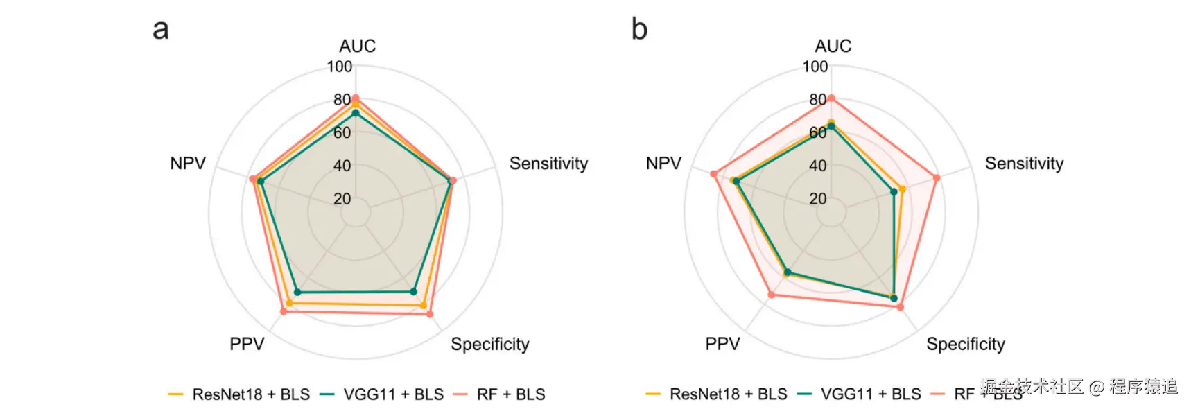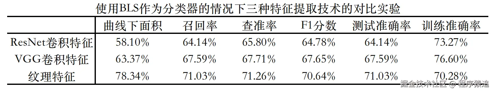 如图所示,我们按照论文步骤,将三种不同类型的特征分别输入到BLS分类器中进行性能的对比实验,可以得到与论文中一致的结果。在到达相似的训练程度时,输入纹理特征的模型相比其他两种特征模型能够在各项指标上取得更好的结果。特别是在医疗领域最为关注的曲线下面积(AUC)这一项中,该模型拉开了比较大的差距。因此我们可以推测出,在基于纹理特征(RF)的BLS模型与基于深度卷积特征(DF)的BLS模型的对比中,前者的结果更容易解释。这是因为RF与BMD高度相关,使得理解输入特征与输出结果之间的关系更加直观。尽管DF可以捕捉高级语义信息,在某些数据类型中可能更有利,但在这个特定任务中,基于RF的BLS模型的分类性能优于基于DF的BLS模型,表明RF在此任务中更为适用。