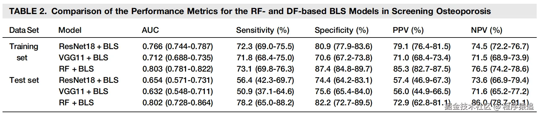 作者指出,“宽度学习系统(BLS)的主要优势之一是其简单的平面结构,这使得学习特征表示和分类数据变得容易。与具有复杂架构的其他机器学习算法不同,BLS 具有简洁的设计,便于特征表示学习和数据分类。这种简单的结构还使得模型能够在大数据集上高效运行,而不需要大量的计算资源。BLS 模型的另一个优势是其权重通过解析计算确定,从而降低了过拟合的风险。就基于纹理特征(RF)的 BLS 模型而言,它产生的结果比基于深度卷积特征(DF) 的 BLS 模型更容易解释。原因是 RF 与 BMD 高度相关,这使得理解输入特征与输出之间的关系变得更容易。DF 可以捕捉高级语义信息,这对于某些类型的数据可能是有益的。然而,在这种情况下,基于 RF 的 BLS 模型的分类性能高于基于 DF 的 BLS 模型,表明 RF 更适合这个特定任务。输入特征的选择,例如 RF 或 DF,会影响结果的可解释性和准确性,在开发 BLS 模型时应谨慎考虑。”