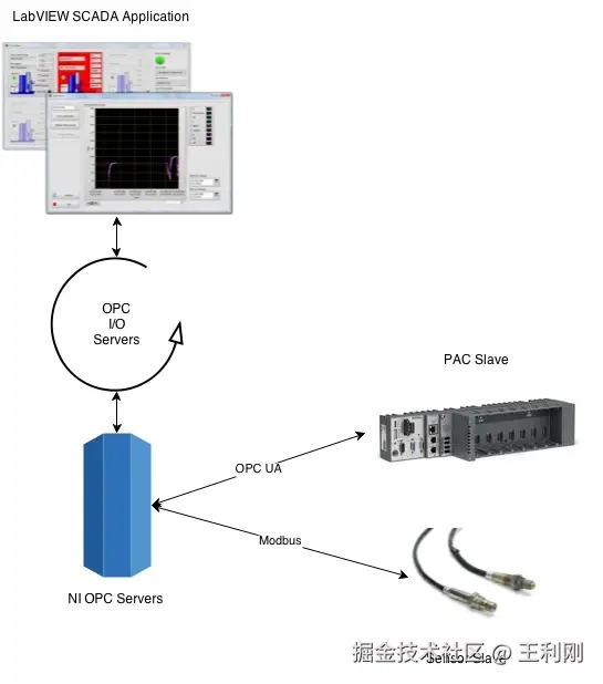 对于涉及多个通过不同协议通信的从设备的复杂应用,标准的 Modbus I/O 可能不足。一个常见的解决方案是使用 OPC 服务器,作为所有系统的数据聚合器,然后使用 LabVIEW DSC 模块中包含的 OPC I/O 服务器与该 OPC 服务器通信。