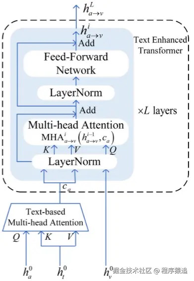 设计了一个文本增强的Transformer(TET)模块,以更好地编码三个信息源。TET通过计算两种模态之间的注意力权重来促进一种模态从另一种模态接收信息,从而促进不同模态的情感相关信息的交互。众所周知,文本是反映说话人情感的最基本、最直观的形式,比视频和音频包含更多的情感相关信息。因此,当视觉模态v和音频模态a被映射和转换到彼此时,融合特征缺乏情感相关的信息和语义。针对这种情况,除了标准的多头注意力编码功能,从其他形式的组合,作者利用面向文本的多头注意力机制,它利用文本来催化音频和视觉形式之间的交互;下图是该模块的运作图:
