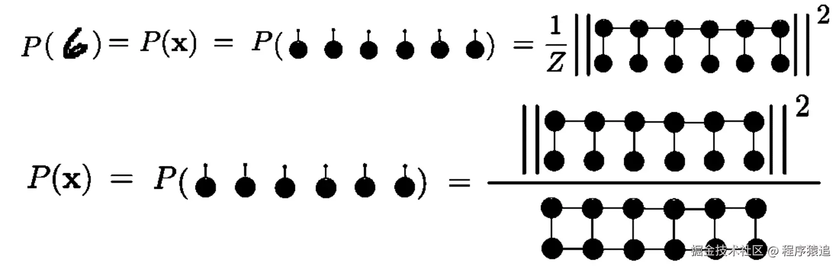 其中值得说明的是Ψ(v1,v2,…,vN)Ψ(v1,v2,…,v N)和P(v1,v2,…,vN)P(v1,v2,…,v N)都是张量(tensor),因为他受制于多个不同的指标v1,v2,…,vNv1,v2,…,v N,此外ZZ作为配分函数代表的是归一化系数,即Z=∑vi∣Ψ(v1,v2,…,vN)∣2Z=∑v i∣Ψ(v1,v2,…,v N)∣2.