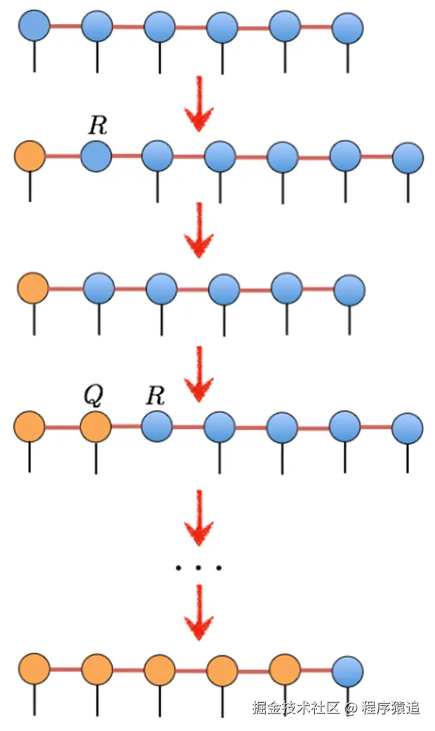 通过不断的对左边的张量作用QR分解从而使得左边张量全部正交化(黄色的)。据此我们可以计算出对应的波函数