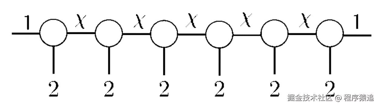 解释一下,χχ表示的是最大截断指标,也就是为了控制整个MPS的维度,防止维度灾难;左右两边的11可以认为是一个空指标,即没有任何含义,只是为了在运算过程中方便,实际是没有这个指标也可以;下面的22表示的是这些指标的维度是2,因为我们只是考虑的像素点只有黑白(1,0)两种状态,也因此下面的22的数目需要28∗28=78428∗28=784个。