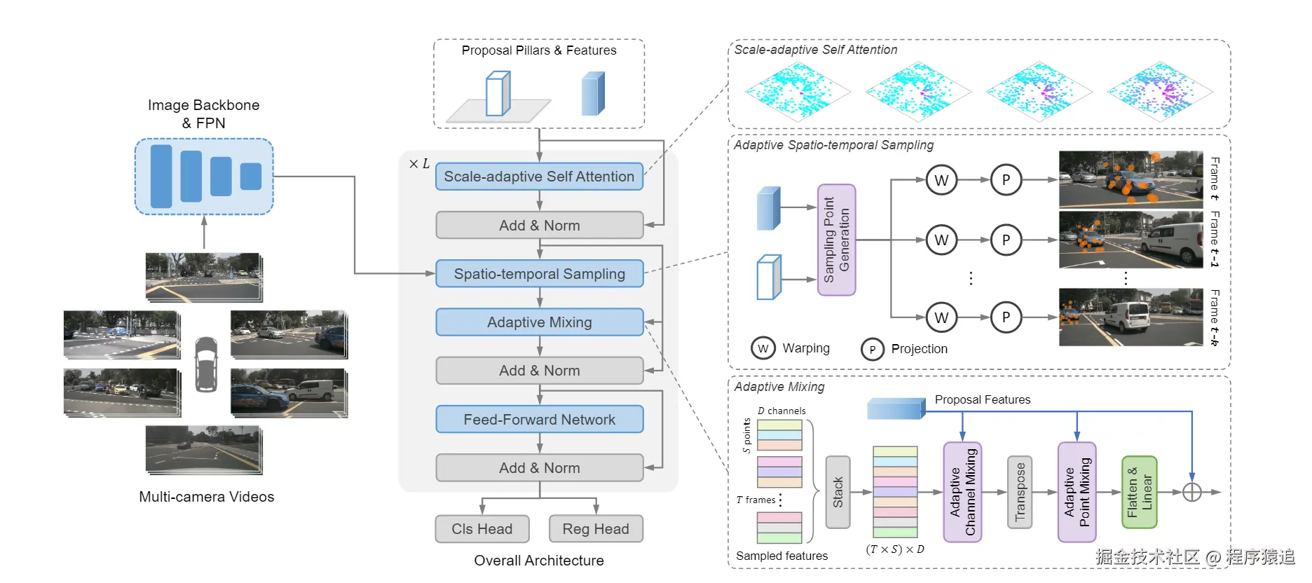 SparseBEV是一个基于查询的单阶段检测器,具有L个解码器层。SparseBEV首先使用图像主干和FPN结构逐帧处理输入的多摄像机视频。之后,在BEV空间中初始化一组稀疏支柱查询,并通过自适应自注意力进行聚合。这些查询通过自适应时空采样和自适应混合与图像特征交互,以进行3D目标检测。