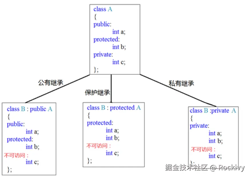 | public继承 | public | protected | 不可访问 |