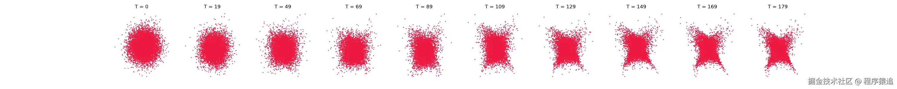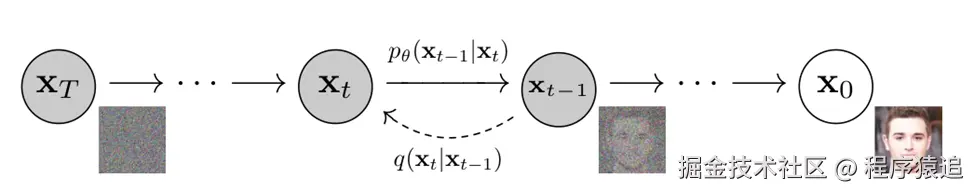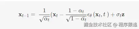 逆向过程即为采样过程,通过一个噪声网络预测噪声,然后一步一步迭代得到最终的采样结果,这个迭代过程可以由之前的推导公式给出,即