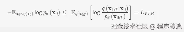 要从前向加噪过程中学习pθ(xt−1|xt)p θ(x t−1∣x t)的前提是知道并确定该模型的训练损失函数。该模型借鉴了变分自动编码器(VAE)的中的思想和推导过程,通过变分优化交叉熵的上界LVLBL V L B来实现。即