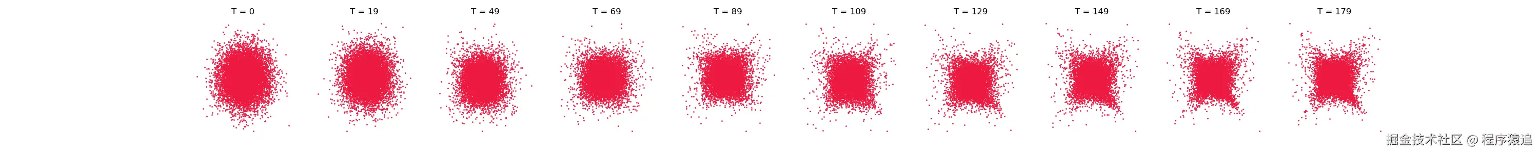首先,我们先观察前向过程,即不断给原始数据加高斯噪声最终将原始数据变成白噪声的过程