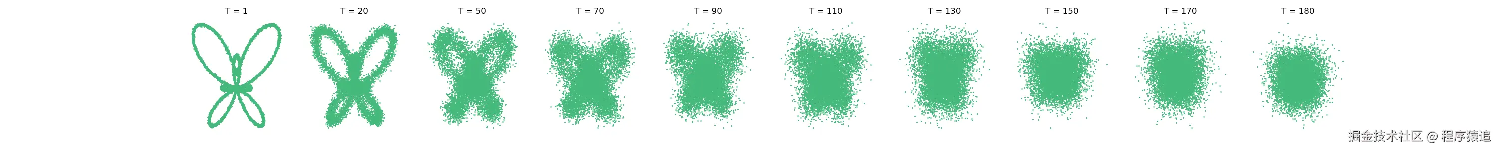 在本文,为了方便我们不去生成图片这种维度较高的数据集,而是以二维点集为例子来说明扩散模型的基本思想。在本文所使用的原始数据的蝴蝶分布,即