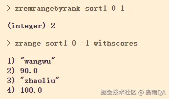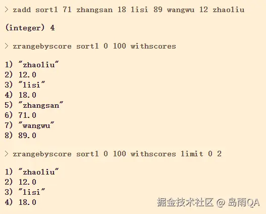 zrangebyscore key min man [withscores] [limit offset count]:返回分数在[min,max]的成员,并按照分数从低到高排序。[withscores]:显示分数;[limit offset count]:表明从脚标为offset的元素开始并返回count个成员