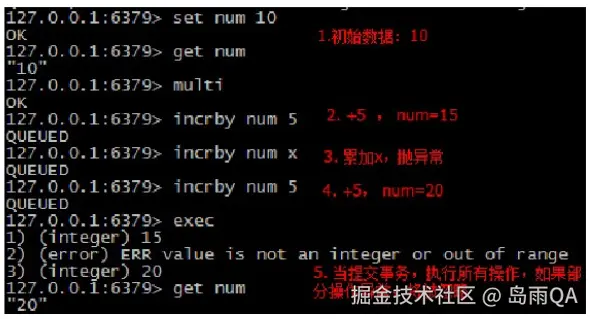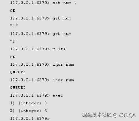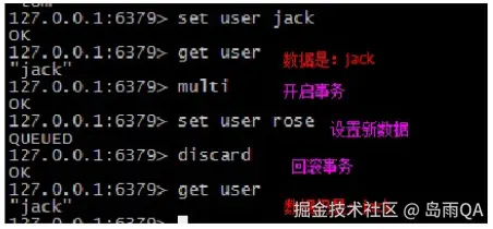 multi:开启事务用于标记事务的开始,其后执行的命令都将被存入命令队列,直到执行EXEC时,这些命令才会被原子的执行,类似与关系型数据库中的:begin transactionexec:提交事务,类似与关系型数据库中的:commit 执行批量化discard:事务回滚,类似与关系型数据库中的:rollback 不执行批量化操作