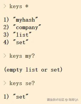 keys pattern:获取所有与pattern匹配的key,返回所有与该key匹配的keys。- *:表示任意0个或多个字符