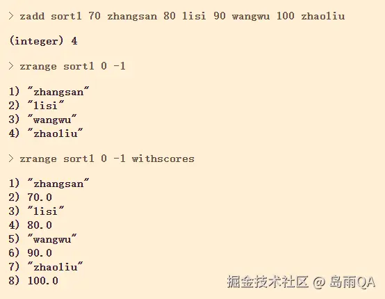 zrange key start end [withscores]:由小到大 获取集合中脚标为start到end的成员,[withscores] 参数表明返回的成员包含其分数