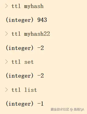 ttl key:获取该key所剩的超时时间。如果没有设置超时时间,返回-1。如果返回-2表示超时不存在。