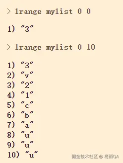 lrange key start end,获取链表中从start到end的元素的值。start、end:从0开始计数;也可以为负数,若为-1则表示链表尾部的元素,-2则表示倒数第二个,依次类推... (Tips:0 -1 是查询所有元素)