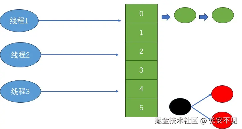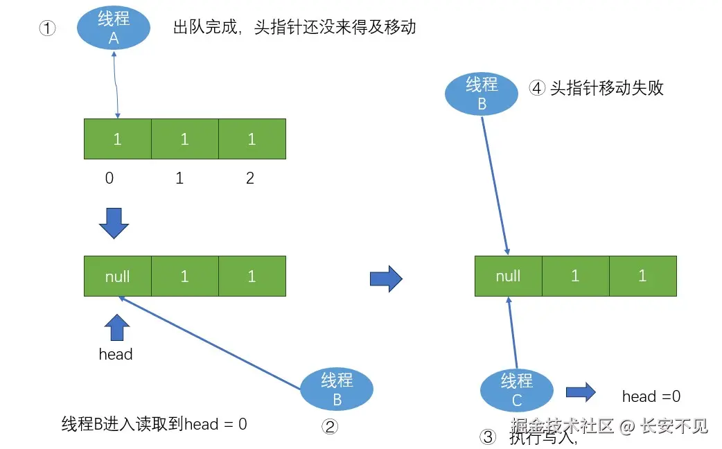 这意味着语句一在正常执行之后,也就是语句二在某些情况下失败,导致语句三没有正常执行,那是怎样的情况呢? 注意观察我们的测试用例,入队的都是相同元素,设队列大小为3,存储的都为1,1,1。设A线程进入获取头指针为0,然后将0位置设置为null,在执行语句二的时候,B线程进入获取head = 0,然后走到语句二的时候,线程C执行写入,将0位置写入元素1,于是语句二执行成功,但是语句三执行失败,这就导致少递减了一次。如下图所示: